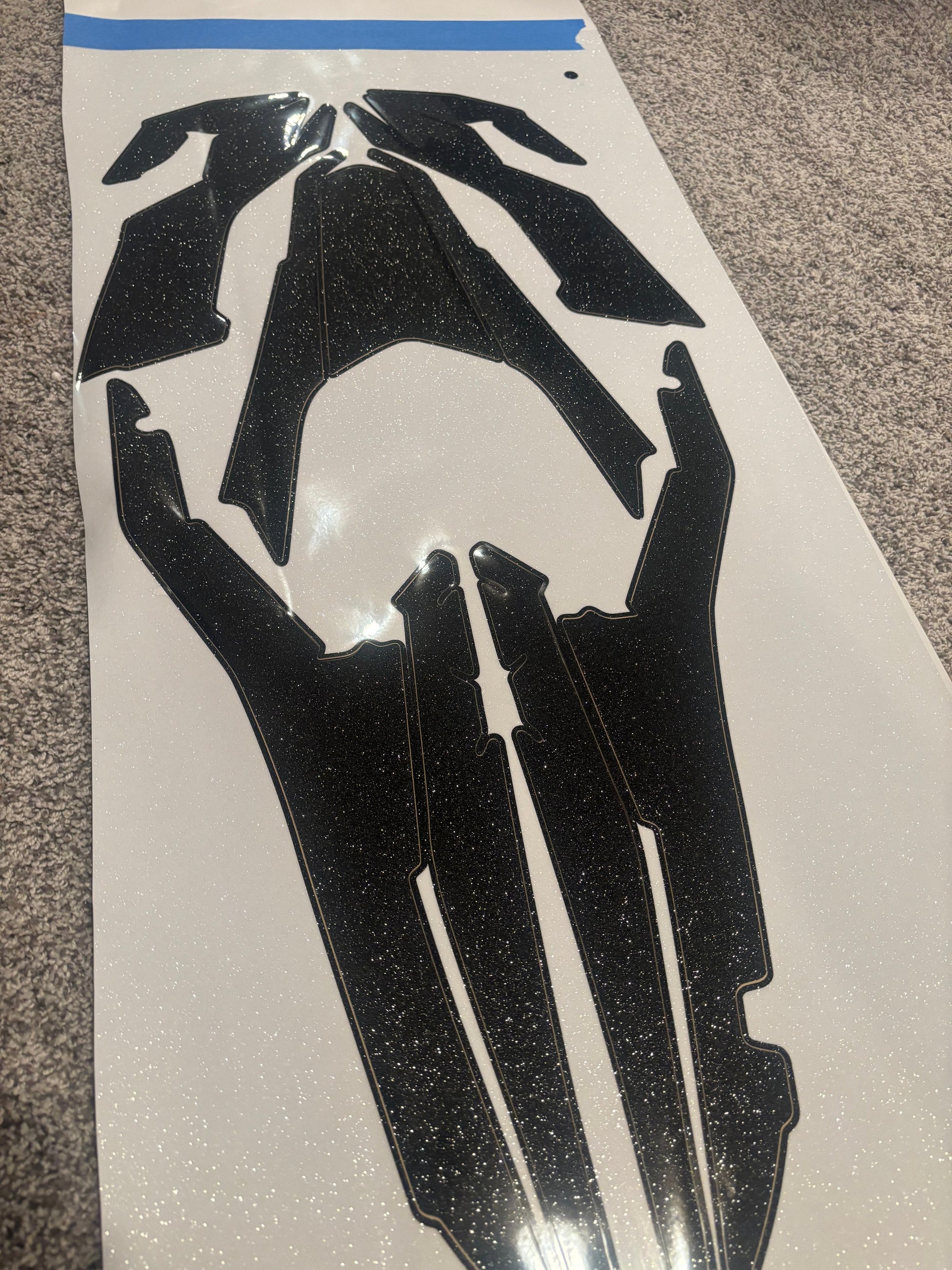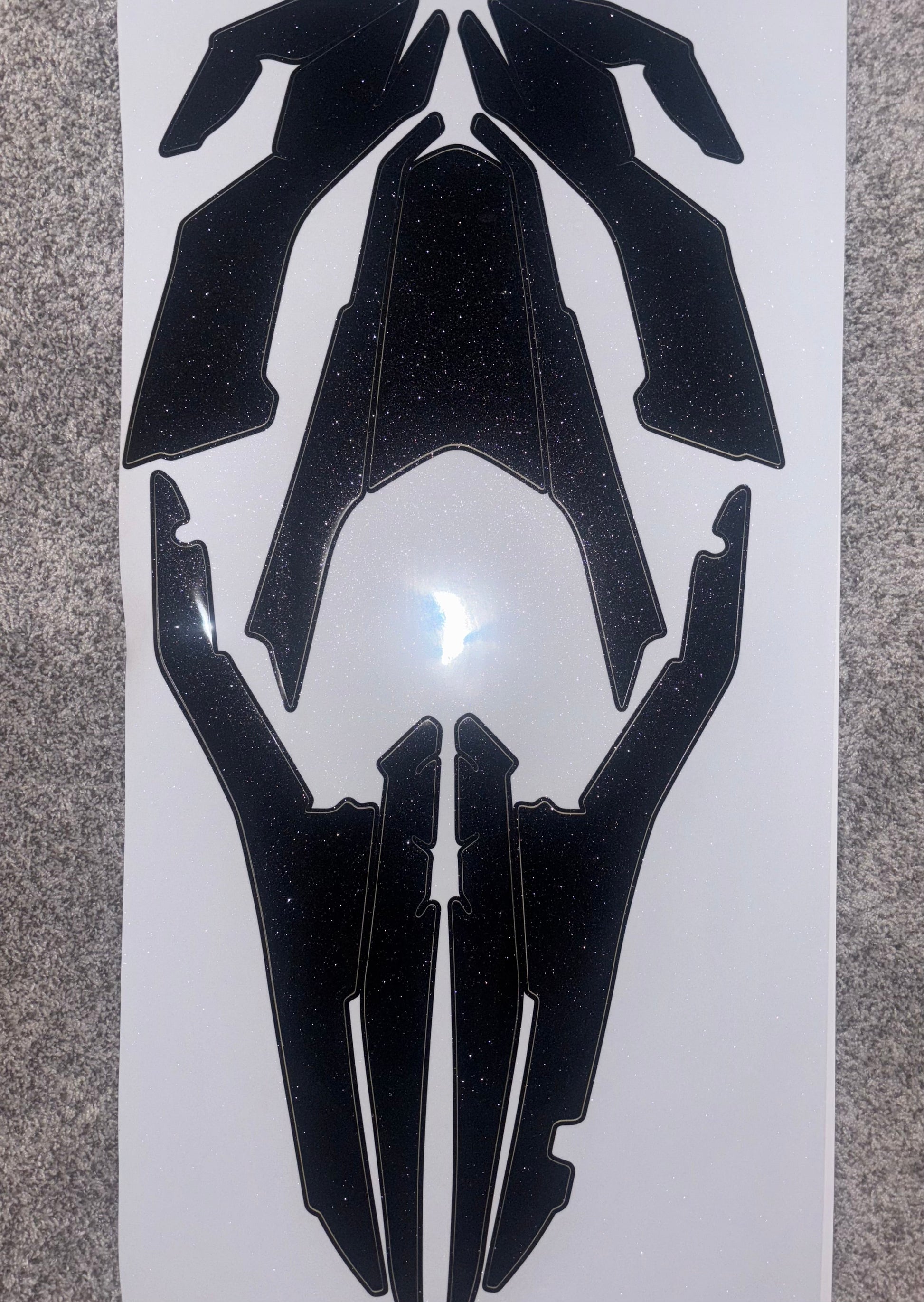 This is a black sparkle wrap for the sides of the Surron Ultra Bee. The kit includes - battery cover sides on both sides of the bike, side plastics on both sides of the bike, and rear fender.